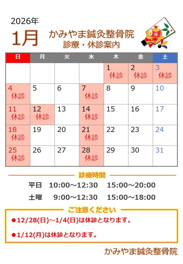 休診日のお知らせ 1月の休診日のお知らせ 2025年12月24日 かみやま鍼灸整骨院スタッフ 下記日程は休診となりますので、ご予約の際はご注意ください。<定休日>毎週水曜日・日曜日12月28日(日)~1月4日(日)1月12日(月) 年末年始の休診日が12/28~1/4となります。ご迷惑をおかけしますが、よろしくお願いいたします。