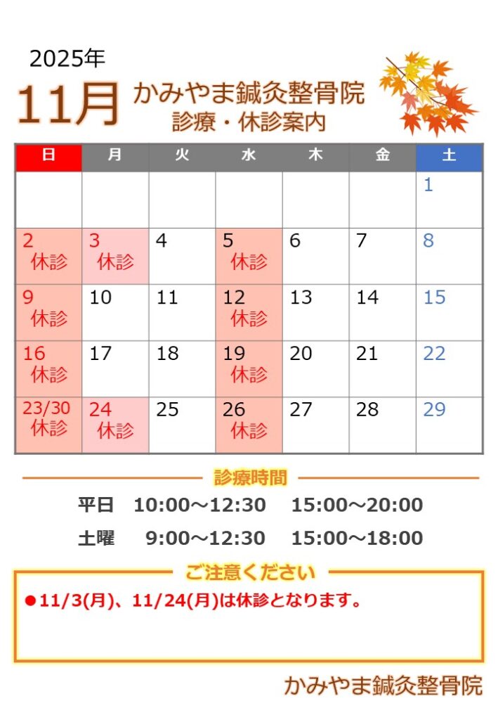 休診日のお知らせ 11月の休診日のお知らせ 2025年10月20日 かみやま鍼灸整骨院スタッフ 下記日程は休診となりますので、ご予約の際はご注意ください。<定休日>毎週水曜日・日曜日11月3日(月)11月24日(月)