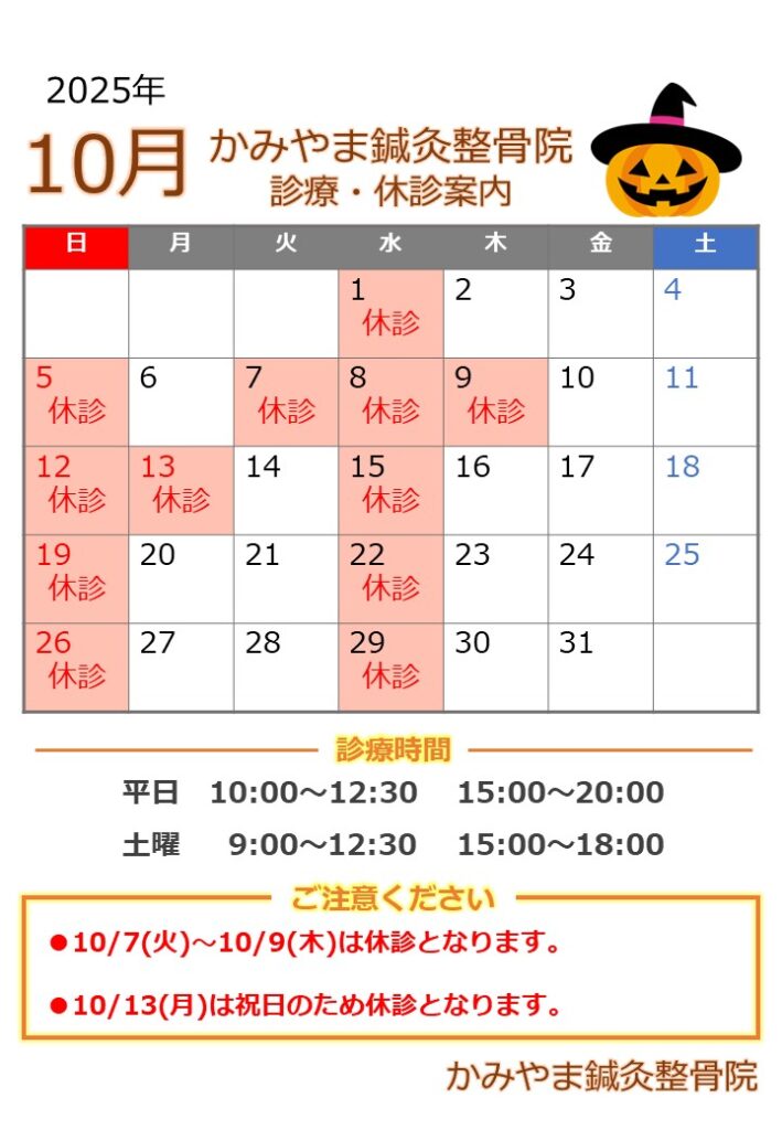 休診日のお知らせ 10月の休診日のお知らせ 2025年9月22日 かみやま鍼灸整骨院スタッフ 下記日程は休診となりますので、ご予約の際はご注意ください。<定休日>毎週水曜日・日曜日10月7日~10月9日(木)10月13日(月)